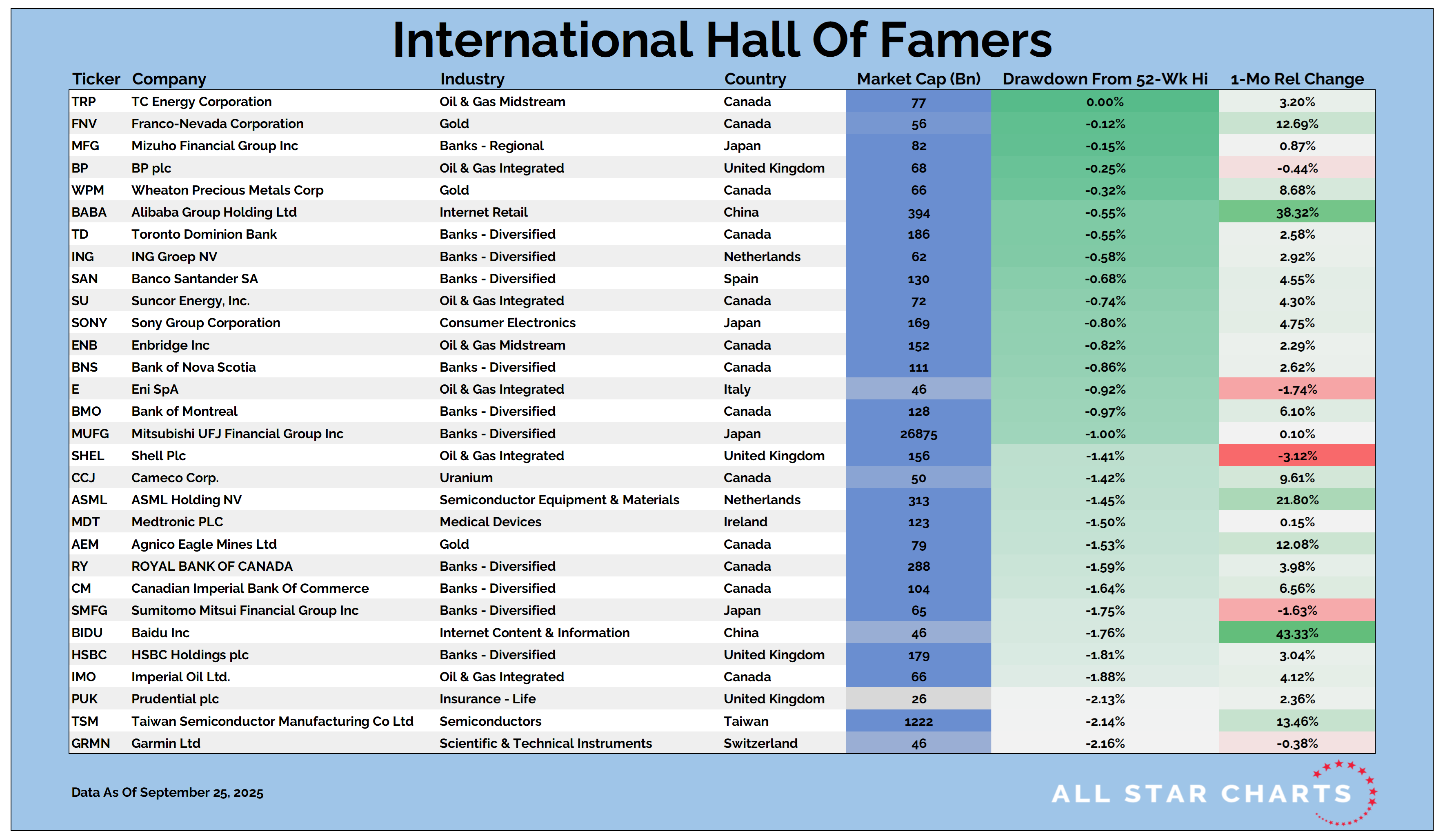 Our International Hall of Famers list is composed of the 100 largest US-listed international stocks, or ADRs.