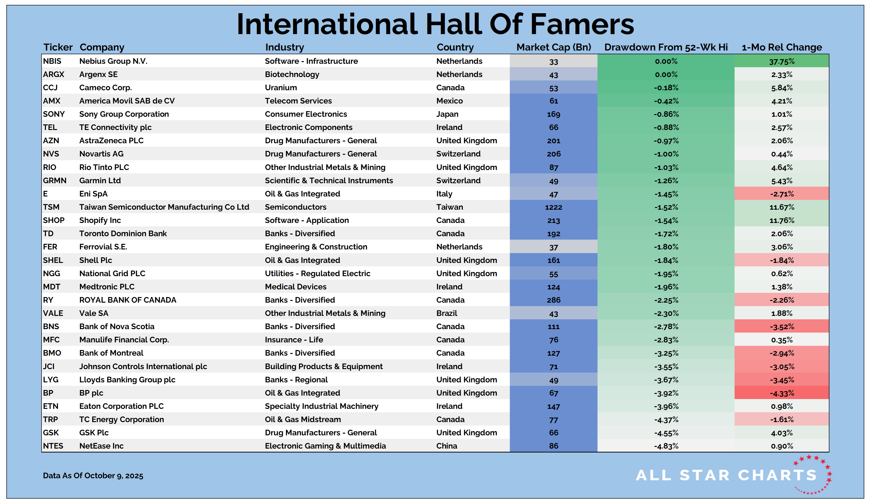 Our International Hall of Famers list is composed of the 100 largest US-listed international stocks, or ADRs.