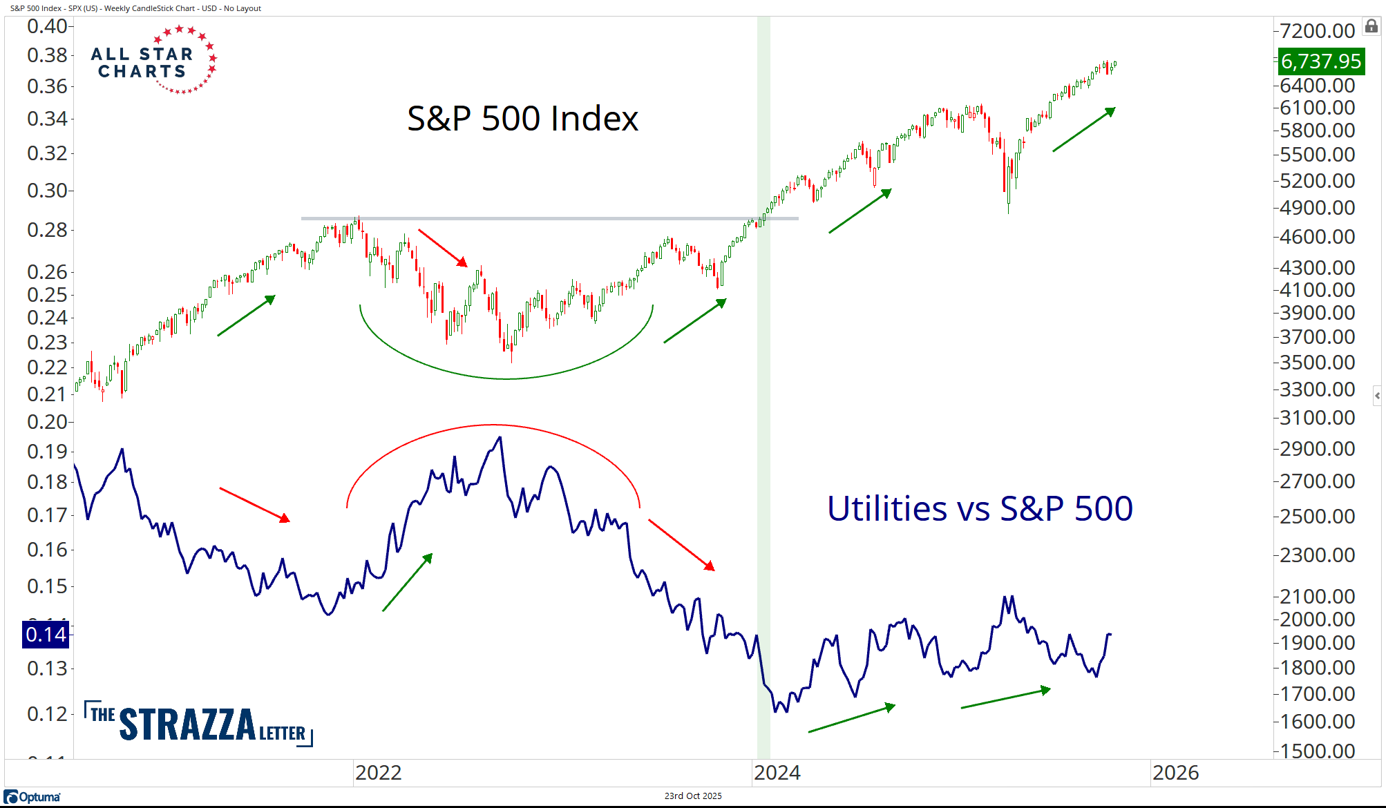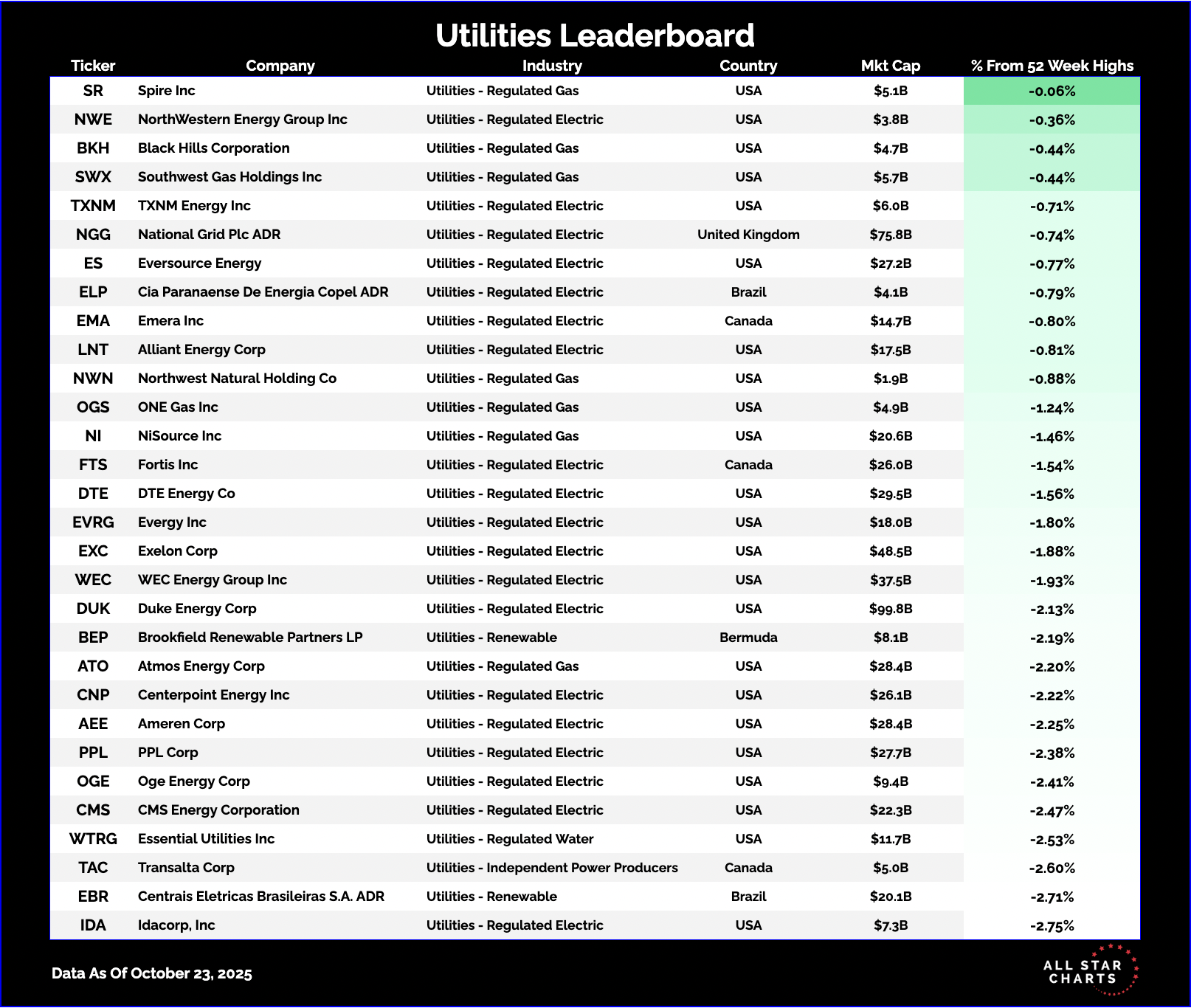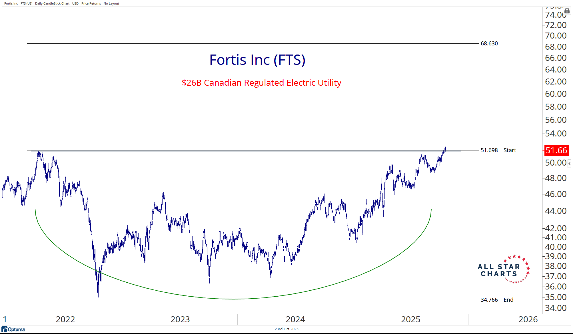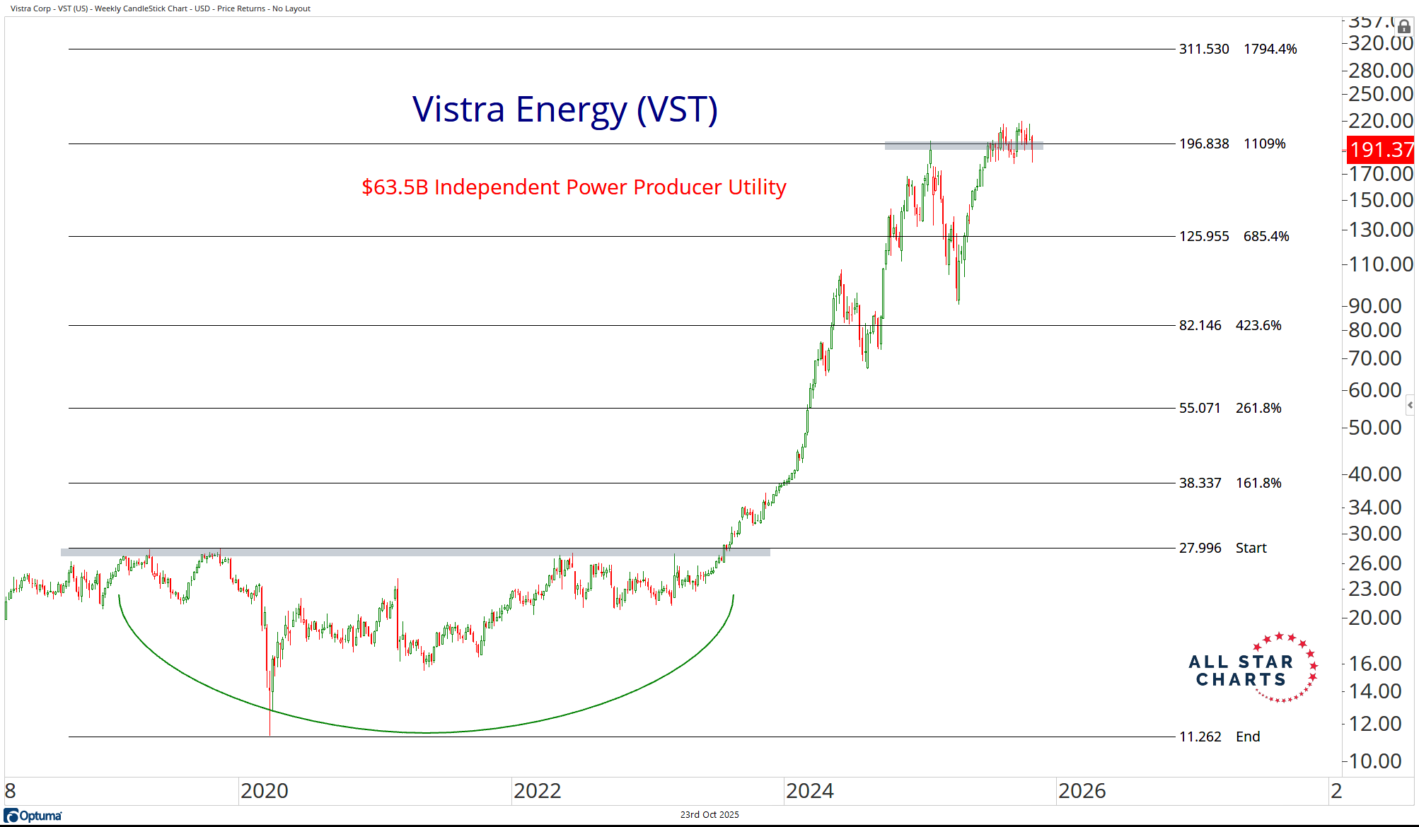 All Star Charts Premium Members Only Special Report: A Utilitarian Tilt By Steve Strazza October 23, 2025 I would usually ignore Utilities stocks during a bull market. They’ve always been one of the “defensive” groups — safe, steady, and rarely exciting.But this cycle, things have been different. Last year, Utilities stopped falling relative to the broader market, signaling a subtle shift in behavior and a big transition in the primary trend. They’re no longer just a safe haven — some names are quietly holding their own, posting steady outperformance while classic risk-off groups lag.On a year to date basis, Utilities are the third best performing sector. Depending on where you dip your toes into this group, you can find pockets of real strength.Not all Utilities are created equal, but the ones demonstrating leadership are demanding our attention. Let’s talk about some of our favorites now.We ran the numbers on our Utility Universe, which includes everything from independent power producers to regulated electrics — both U.S. and global.Here’s what the leadership picture looks like: Now, let’s dig into the setups: First up is a $26B regulated electric utility company from Canada. Here is Fortis $FTS: Fortis is on the verge of breaking out of a massive multi-year base, as price pierce through the upper bounds of its range..We like FTS long above 51, targeting 68 over the next 2–4 months.This stock pays a ~3.50% dividend yield. Our second setup today is an $63.5B independent power producer from Texas. This is Vistra Energy $VST: Vistra $VST has been a leader in the utilities space all cycle, climbing roughly 800% since breaking out in the summer of 2023. Price has spent most of the year consolidating constructively near the 1,109% Fibonacci extension, setting the stage for a fresh leg higher. We only want to be long VST on strength above 197, targeting 311.(If you're not a member of ASC Premium and want access to the trade ideas from this post, join us risk-free.) You need to have a subscription to access this content in full. Log in or subscribe today to unlock new features and receive Member Benefits. Log in or Subscribe More from All Star Charts Premium Steve Strazza Young Aristocrats (October 2025) October 23, 2025 Steve Strazza 2 to 100 Club October 22, 2025 Sam Gatlin Jason Perz Time to Take a Breather October 20, 2025