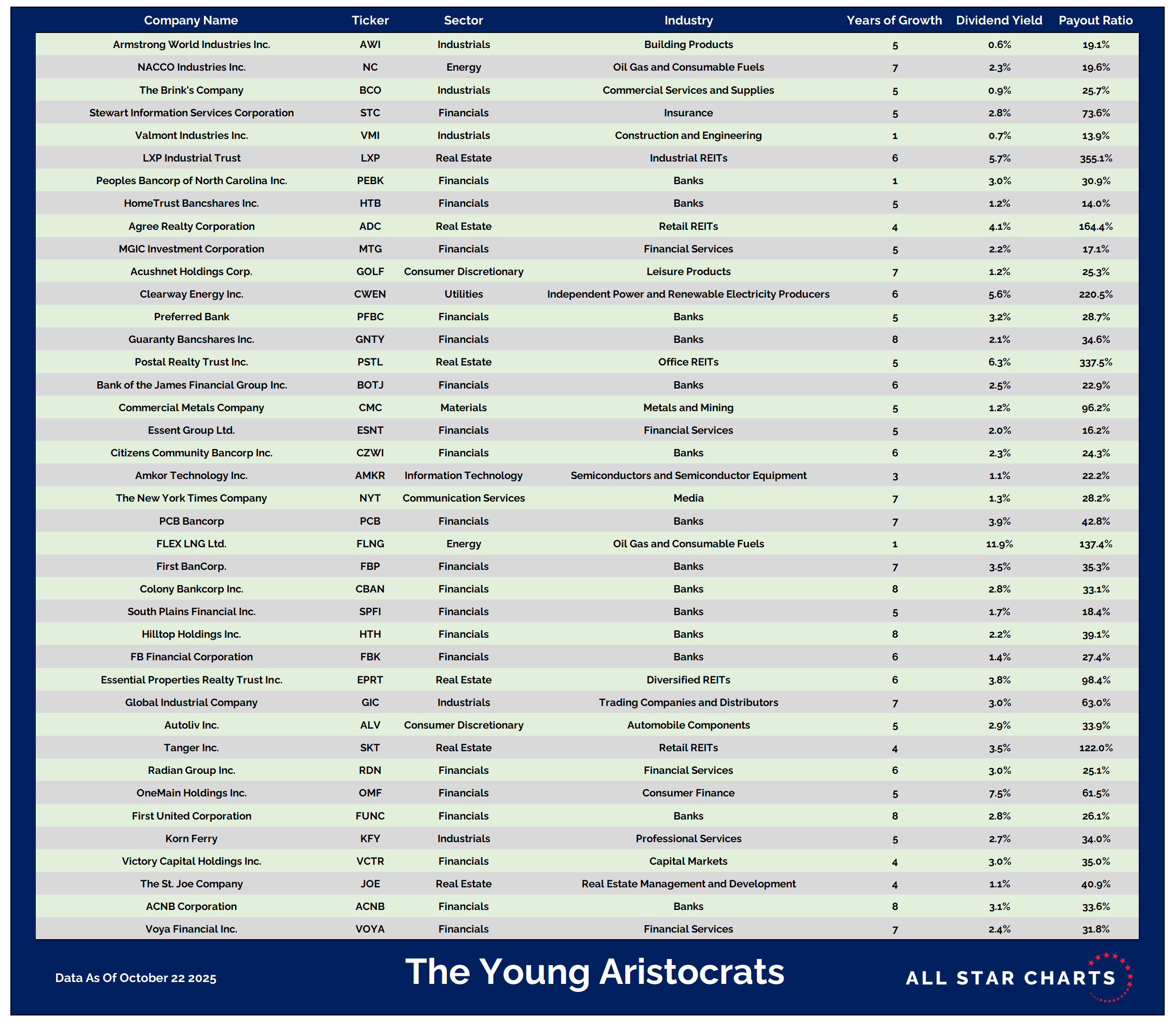 Here at All Star Charts, we like to stay ahead of the curve. That's why we're turning our attention to the future aristocrats. In an effort to seek out the next generation of the cream-of-the-crop dividend plays, we're curating a list of stocks that have raised their payouts every year for five to nine years.