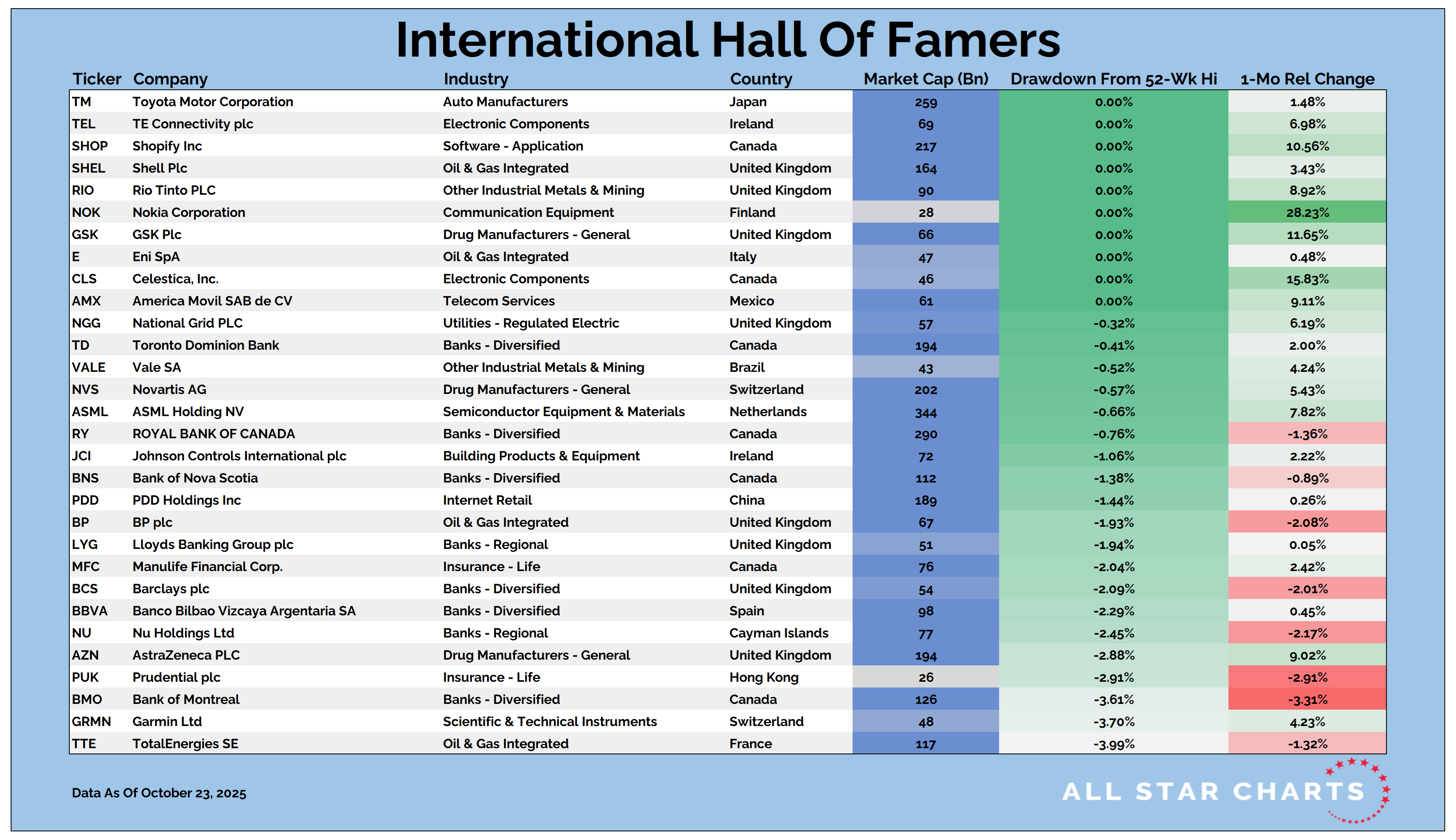 Our International Hall of Famers list is composed of the 100 largest US-listed international stocks, or ADRs.