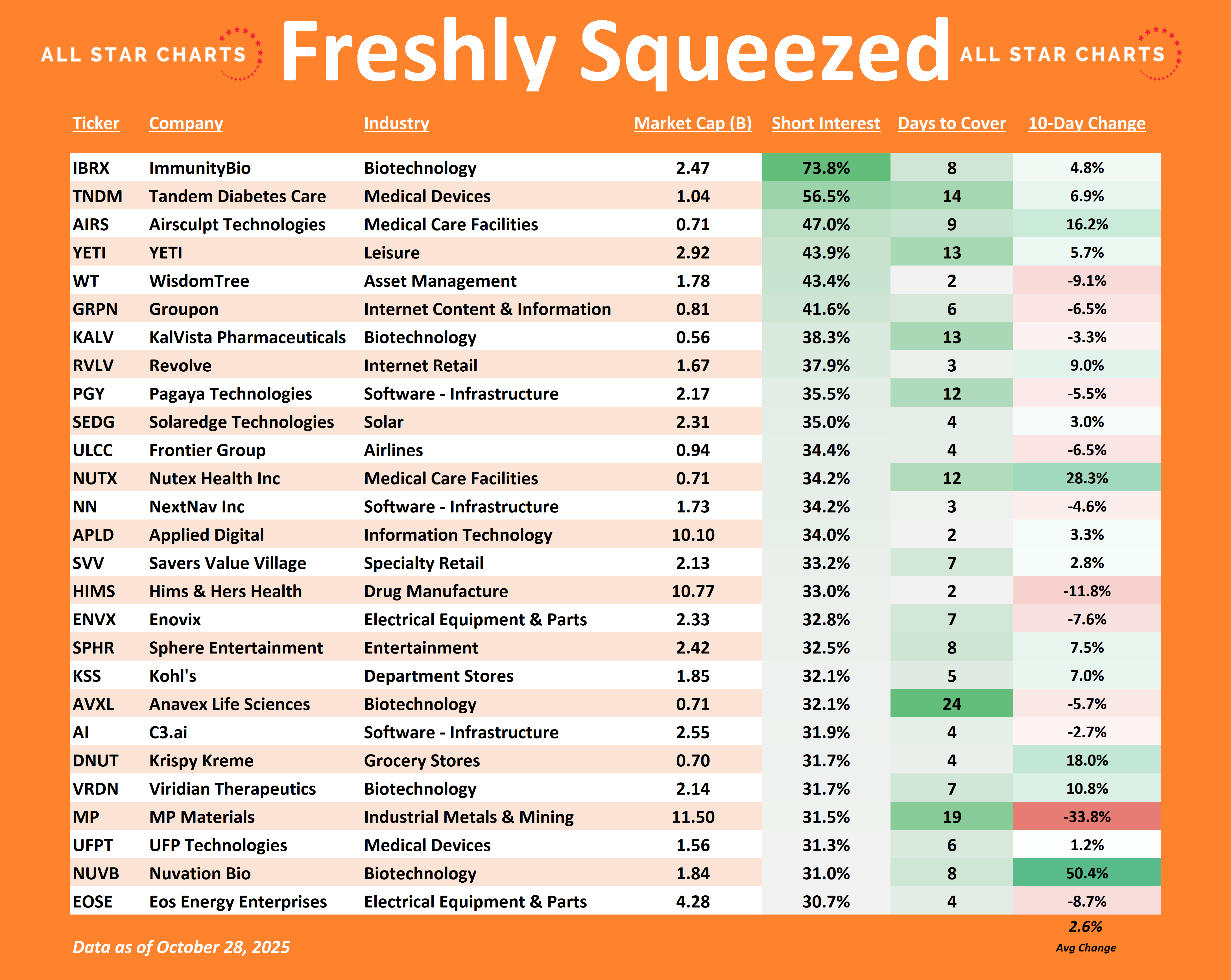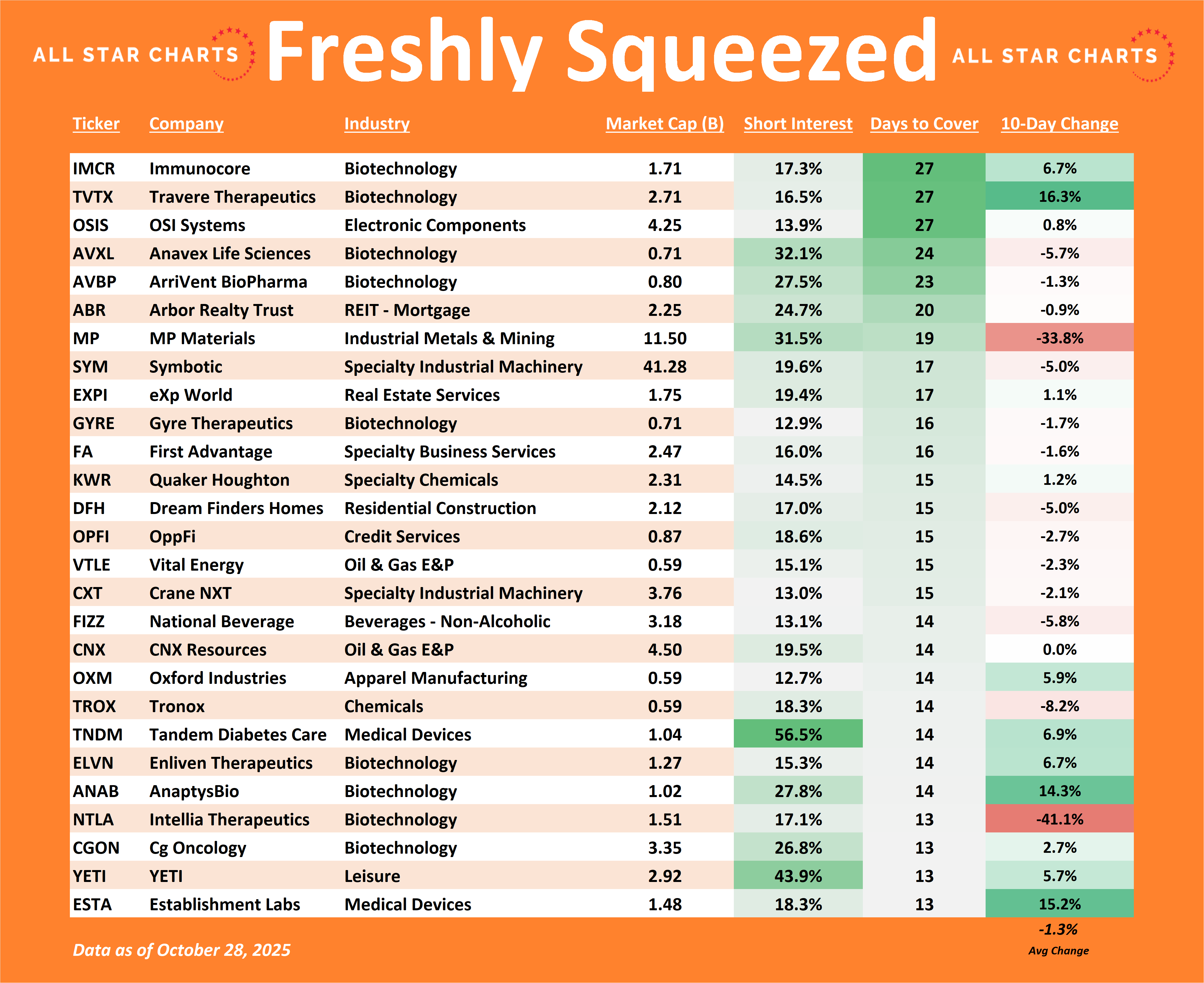 We’re also tracking squeeze candidates by short interest and days-to-cover, two critical ingredients for sustained upside. These are where the next squeezes will come from.
