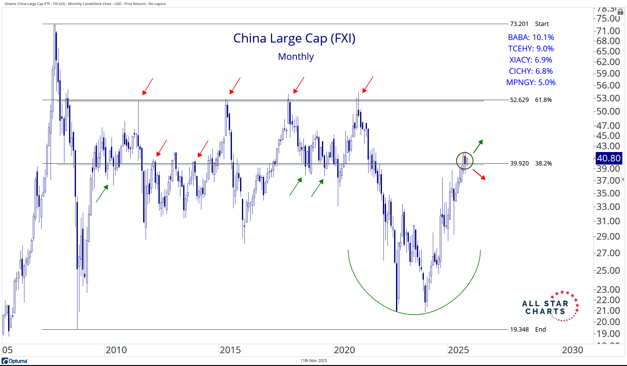 Now, with a primary trend reversal firmly in place, Chinese large caps FXI are pressing against a major polarity zone near 40 — an area that’s acted as both support and resistance for nearly two decades.