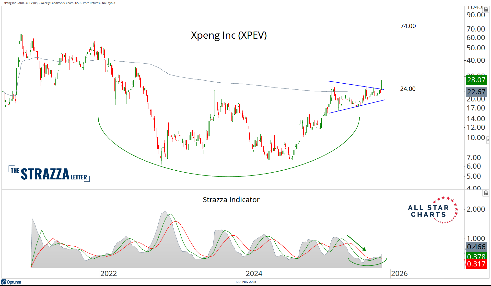 Next is Xpeng $XPEV, which is completing a primary trend reversal as the Strazza Indicator signals volatility expansion is underway.