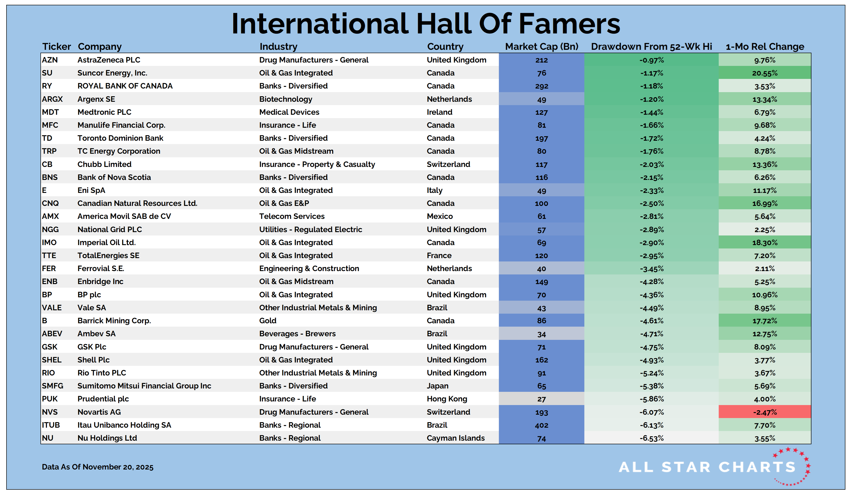 Our International Hall of Famers list is composed of the 100 largest US-listed international stocks, or ADRs.
