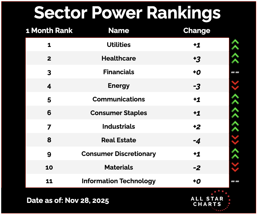 This week’s standout is Healthcare, which jumped three spots to break into the top two of our sector rankings.