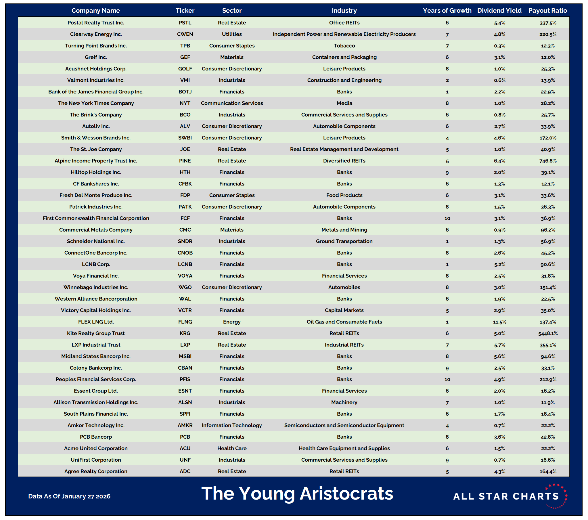 We call them the Young Aristocrats, and the idea is that these are "stocks that pay you to make money." Imagine if years of consistent dividend growth and high momentum and relative strength had a baby, leaving you with the best of the emerging dividend giants that are outperforming the averages.