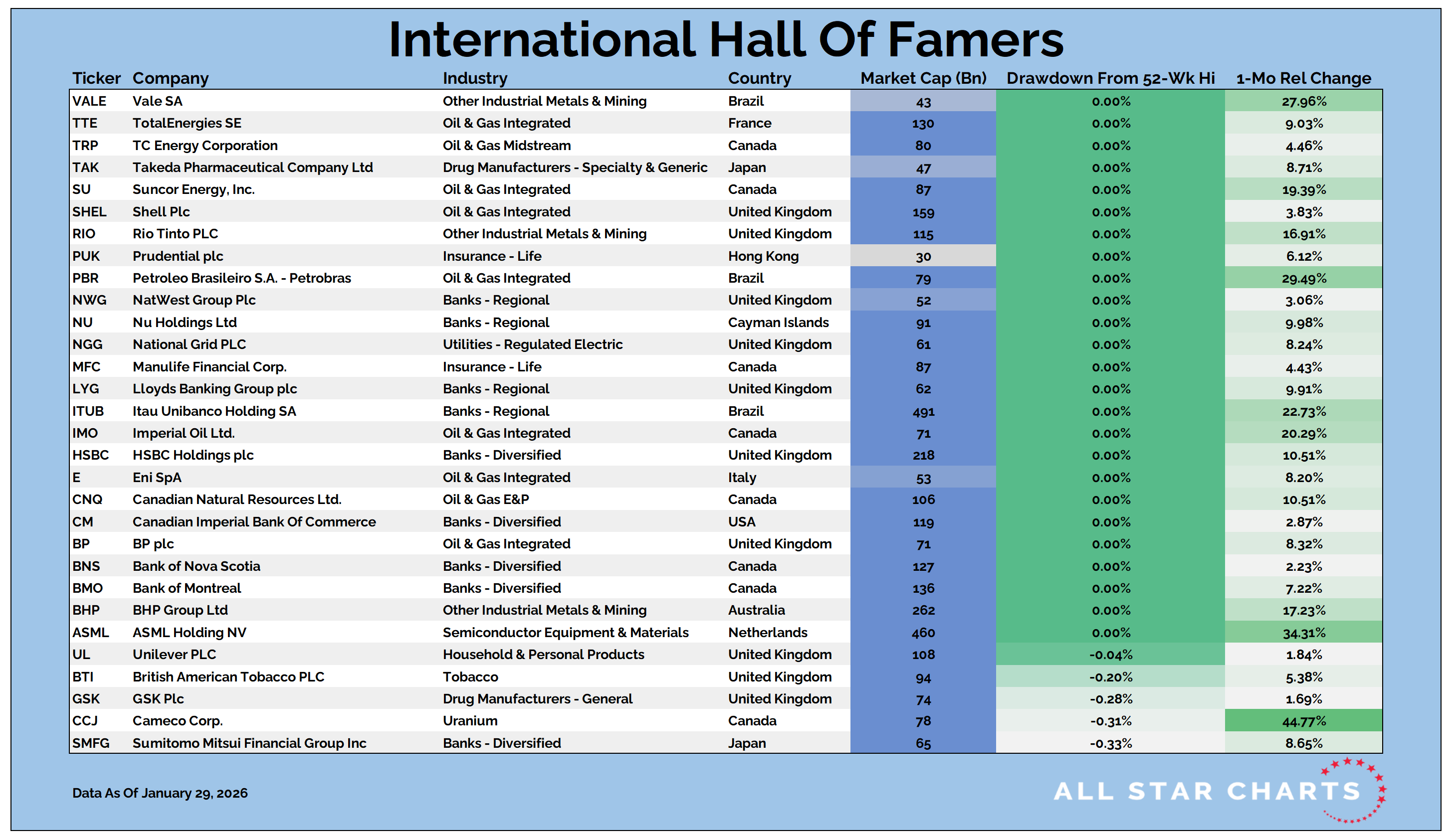 Our International Hall of Famers list is composed of the 100 largest US-listed international stocks, or ADRs.