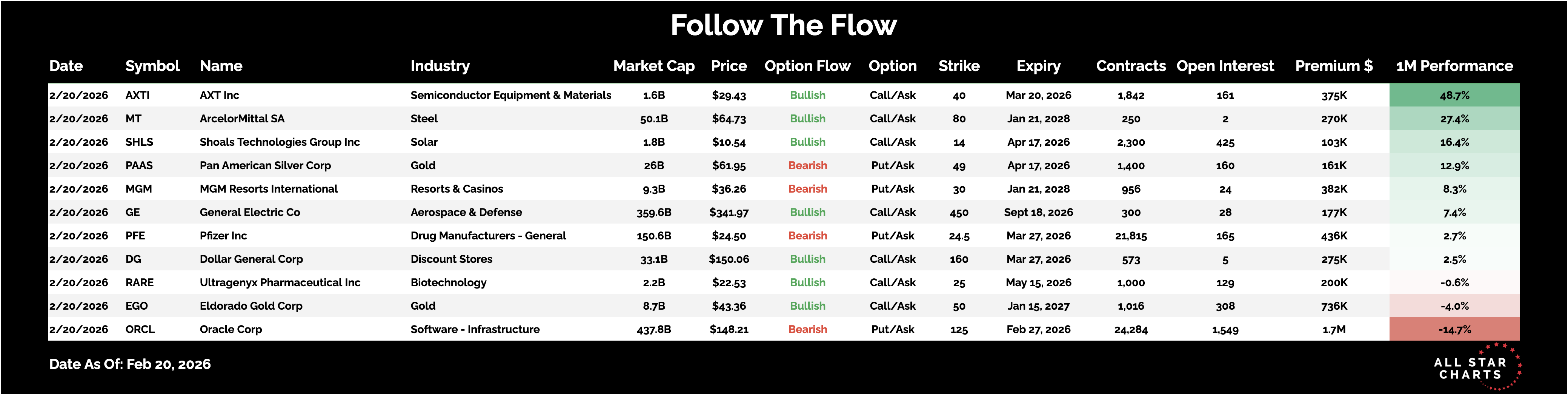 The Daily Flow Energy Transition & AI Hardware Rotation Fuel Bullish Conviction By Steve Strazza February 20, 2026 This note highlights a select group of stocks showing the most unusual — and highly directional — options activity.The goal is simple: follow the big money and trade in the direction of the underlying trend.Here is the list of Unusual Options activity from February 20: *Click to enlarge viewShoals Technologies $SHLS — Solar continues to rotate back into focus as energy transition themes stay active.Bullish flow showed up with 2,300 contracts of the 4/17 $14 calls, as traders position for a potential bearish-to-bullish reversal.AXT Inc $AXTI — Semiconductor equipment remains on the radar as AI-driven demand and supply chain resilience support the group.AXTI saw 1,842 contracts of the 3/20 $40 calls trade, with roughly $375K in premium, a notable near-term upside bet.ArcelorMittal $MT — Steel is quietly firming up as infrastructure spending and tariff dynamics create a constructive backdrop.A longer-term conviction trade hit the tape with 250 contracts of the 1/21/28 $80 calls, putting over $250K in premium to work in a LEAPS position. All Star Charts Premium Service Menu Service (ASC Premium) Trade Ideas Conference Calls Research Reports 2 to 100 Club Boomtown Commodities Weekly Currency Report Follow The Flow Freshly Squeezed Hall of Famers International Hall of Famers Junior Hall of Famers Junior International Hall of Famers Minor Leaguers Supercycle Report The Bond Report The Short Report Top Down Trade Of The Week Top Stocks Of The Month Under The Hood Young Aristocrats Saturday Morning Chartoons Contact More from All Star Charts Premium Sam Gatlin The Most Hated Stocks Are Going Vertical Short sellers are being forced to unwind their positions, and it's sparking massive short squeezes. April 16, 2026 Sam Gatlin Junior Hall of Famers April 16, 2026 Steve Strazza The Daily Flow Uranium Is Glowing, Biotech Is Breathing, and the Big Bank Is Back April 15, 2026 More from All Star Charts Premium ASC Mastermind Join Today 2 to 100 Club Join Today The Strazza Letter Subscribe