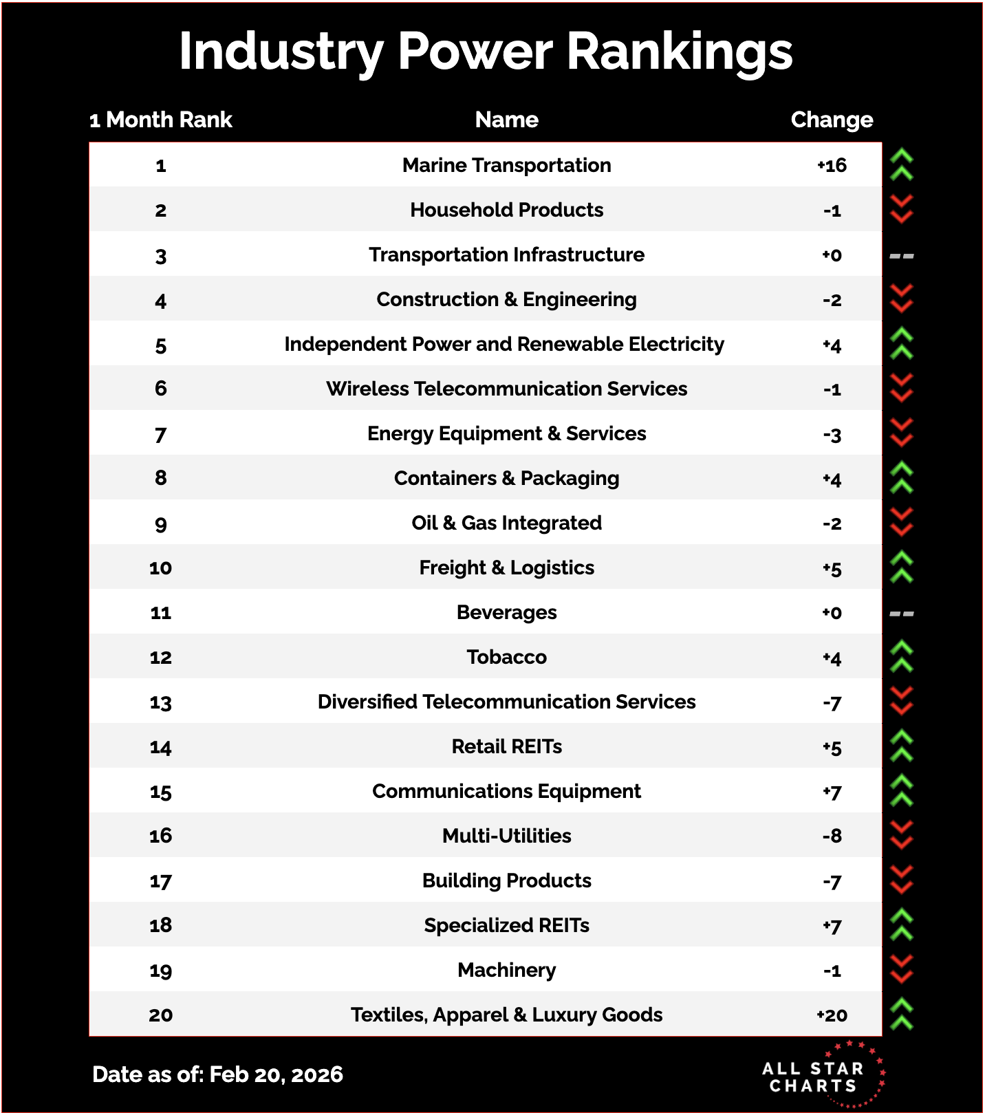 Here’s a peek at our overall industry rankings, which show Textiles, Apparel & Luxury Goods with the biggest improvement on the week, sending it into the top 20.