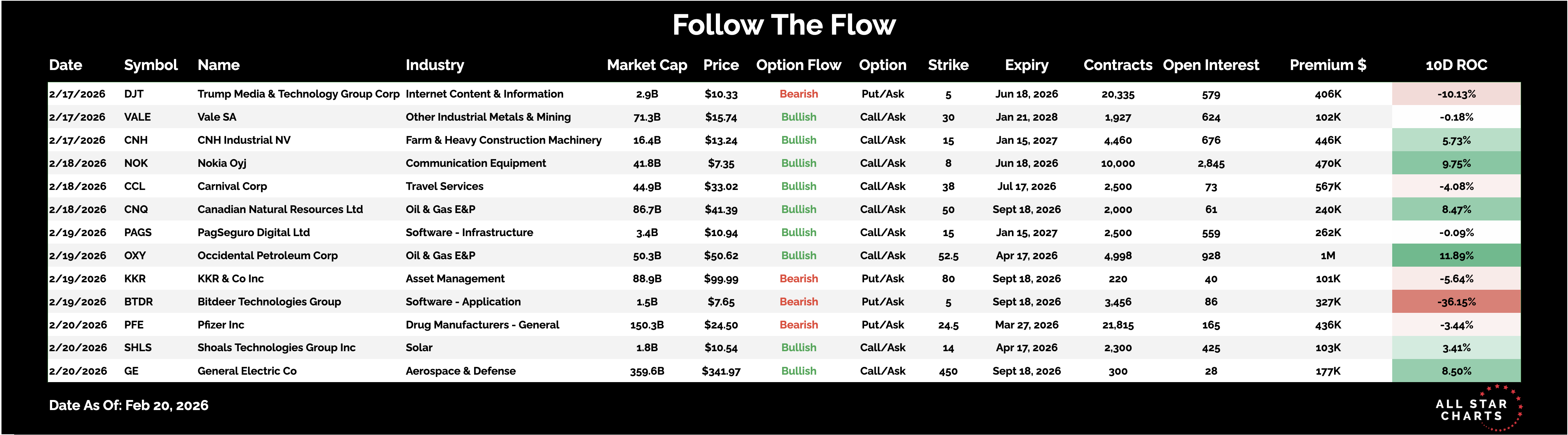 Members Only Follow the Flow Heavy Call Buying Signals Upside Conviction in Telecom Gear By Steve Strazza February 22, 2026 Every weekend I dig through the names that experienced the most interesting unusual options activity. We’re looking for trades that stood out, whether it was large in size or a very aggressive strike selection.This gives us a clean list to review and potentially add some names to our watchlists in preparation for the upcoming week.Here is the list of the most interesting Unusual Options activity from this past week: *Click to enlarge view You need to have a subscription to access this content in full. Log in or subscribe today to unlock new features and receive Member Benefits. Log in or Subscribe All Star Charts Premium Service Menu Service (ASC Premium) Trade Ideas Conference Calls Research Reports 2 to 100 Club Boomtown Commodities Weekly Currency Report Follow The Flow Freshly Squeezed Hall of Famers International Hall of Famers Junior Hall of Famers Junior International Hall of Famers Minor Leaguers The Gold Rush The Bond Report The Short Report Top Down Trade Of The Week Top Stocks Of The Month Under The Hood Young Aristocrats Saturday Morning Chartoons Contact More from All Star Charts Premium Steve Strazza Top Down Trade of the Week (02/21/2026) Buying new leadership in the sports apparel space February 21, 2026 Saturday Morning Chartoons: There's Strength Underneath the Surface February 21, 2026 Steve Strazza The Daily Flow Energy Transition & AI Hardware Rotation Fuel Bullish Conviction February 20, 2026 More from All Star Charts Premium All Star Charts Gold Rush Join Today The Strazza Letter Subscribe ASC Gold Rush Live Watch Now