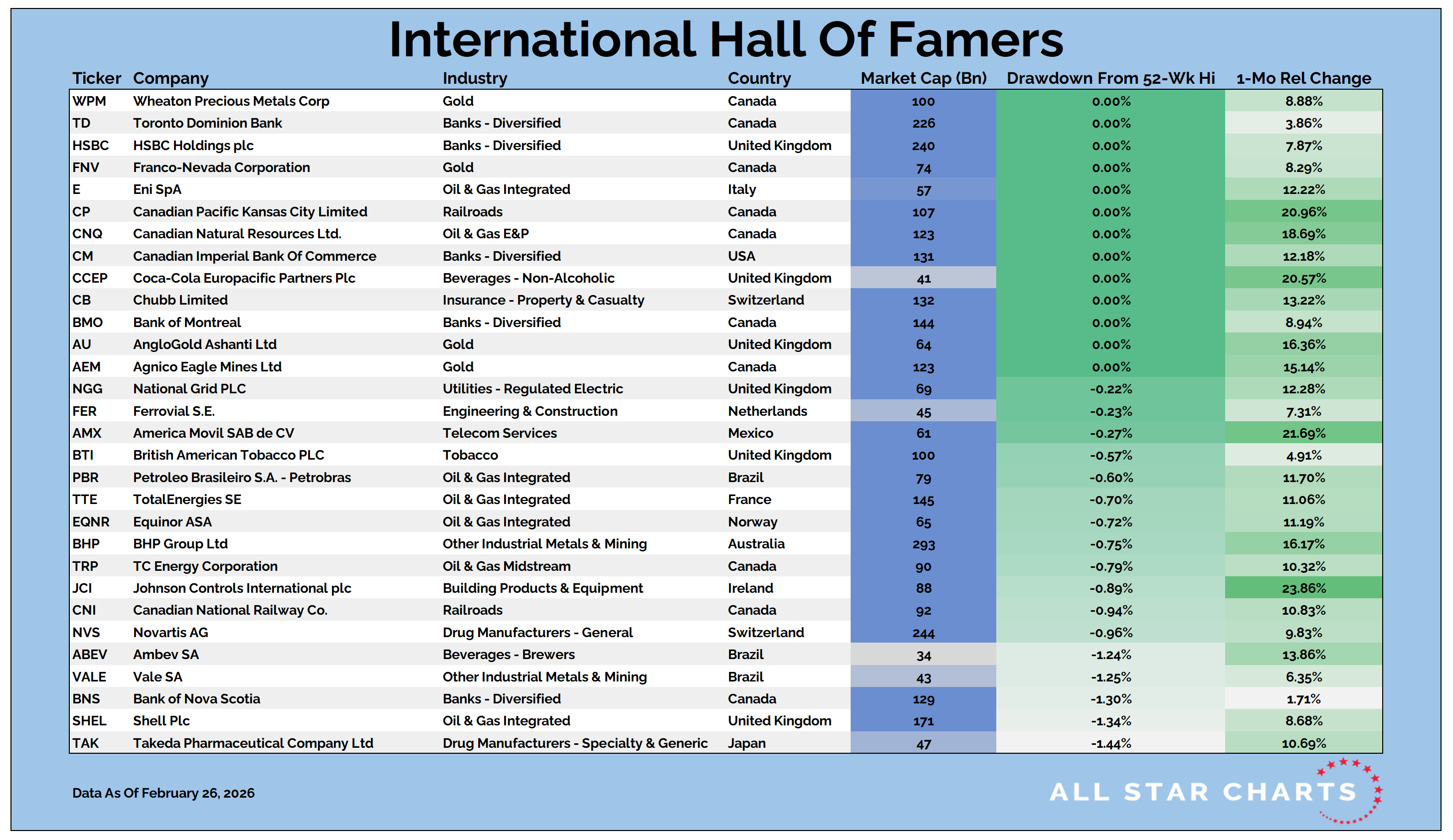 Our International Hall of Famers list is composed of the 100 largest US-listed international stocks, or ADRs.