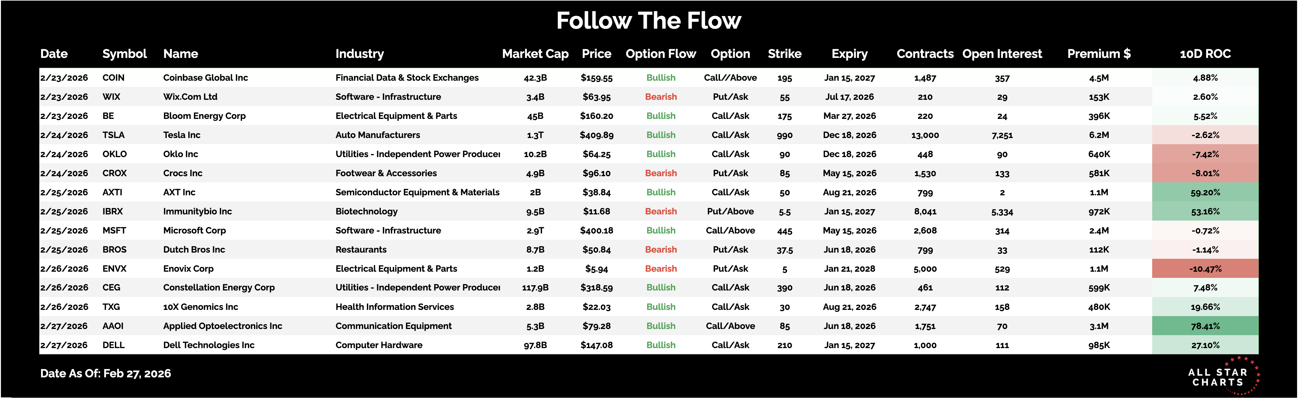 Members Only Follow the Flow Bullish Flows Pile Into A Genomics Leader By Steve Strazza March 1, 2026 Every weekend I dig through the names that experienced the most interesting unusual options activity. We’re looking for trades that stood out, whether it was large in size or a very aggressive strike selection.This gives us a clean list to review and potentially add some names to our watchlists in preparation for the upcoming week.Here is the list of the most interesting Unusual Options activity from this past week: *Click to enlarge view You need to have a subscription to access this content in full. Log in or subscribe today to unlock new features and receive Member Benefits. Log in or Subscribe All Star Charts Premium Service Menu Service (ASC Premium) Trade Ideas Conference Calls Research Reports 2 to 100 Club Boomtown Commodities Weekly Currency Report Follow The Flow Freshly Squeezed Hall of Famers International Hall of Famers Junior Hall of Famers Junior International Hall of Famers Minor Leaguers The Gold Rush The Bond Report The Short Report Top Down Trade Of The Week Top Stocks Of The Month Under The Hood Young Aristocrats Saturday Morning Chartoons Contact More from All Star Charts Premium Steve Strazza Under The Hood March 2, 2026 Steve Strazza The Top Stocks of February March 1, 2026 Steve Strazza Top Down Trade of the Week (02/28/2026) It’s time to buy real estate February 28, 2026 More from All Star Charts Premium The Strazza Letter Subscribe ASC Mastermind Join Today ASC Gold Rush Report Subscribe