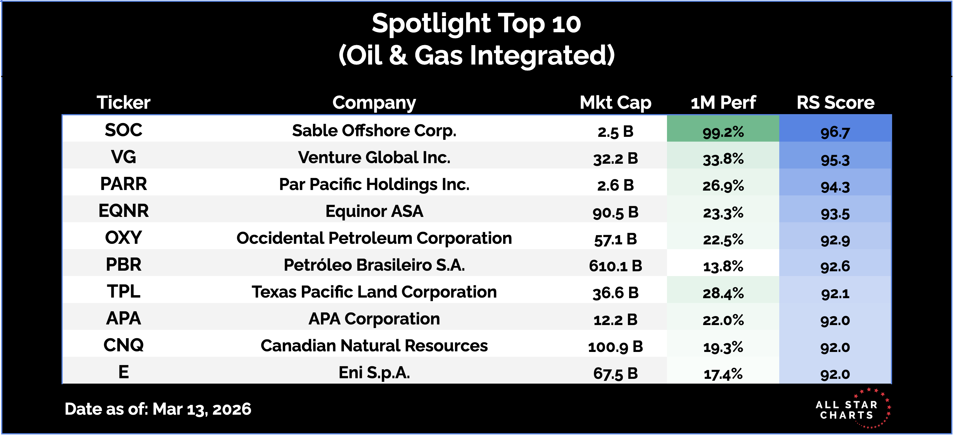Here are the Top 10 names in the Oil & Gas Integrated subsector, ranked by relative strength.