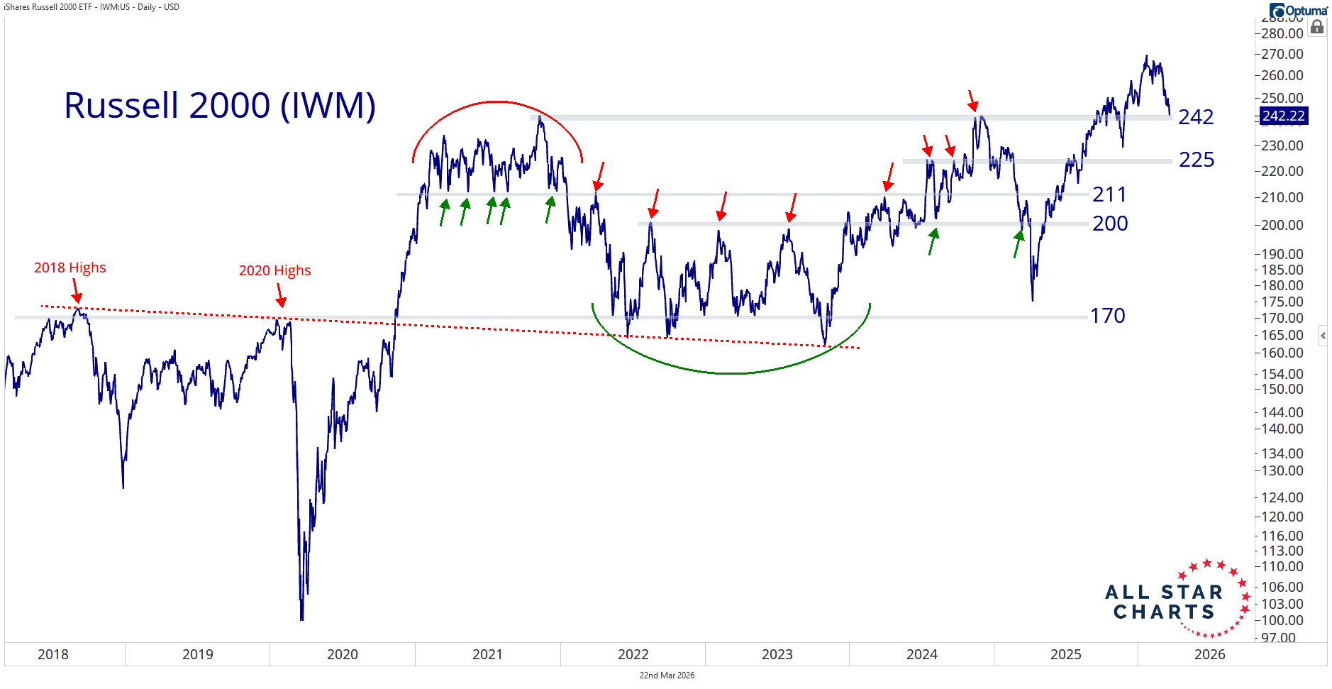 IWM is retesting its prior cycle highs. 242 is the key level we’re watching. If it holds, it would represent a healthy retest — and a clear point on the board for the bulls. But if price fails to hold this zone and slips back into the former range, it would give the bears a meaningful win and potentially mark a major failed breakout.