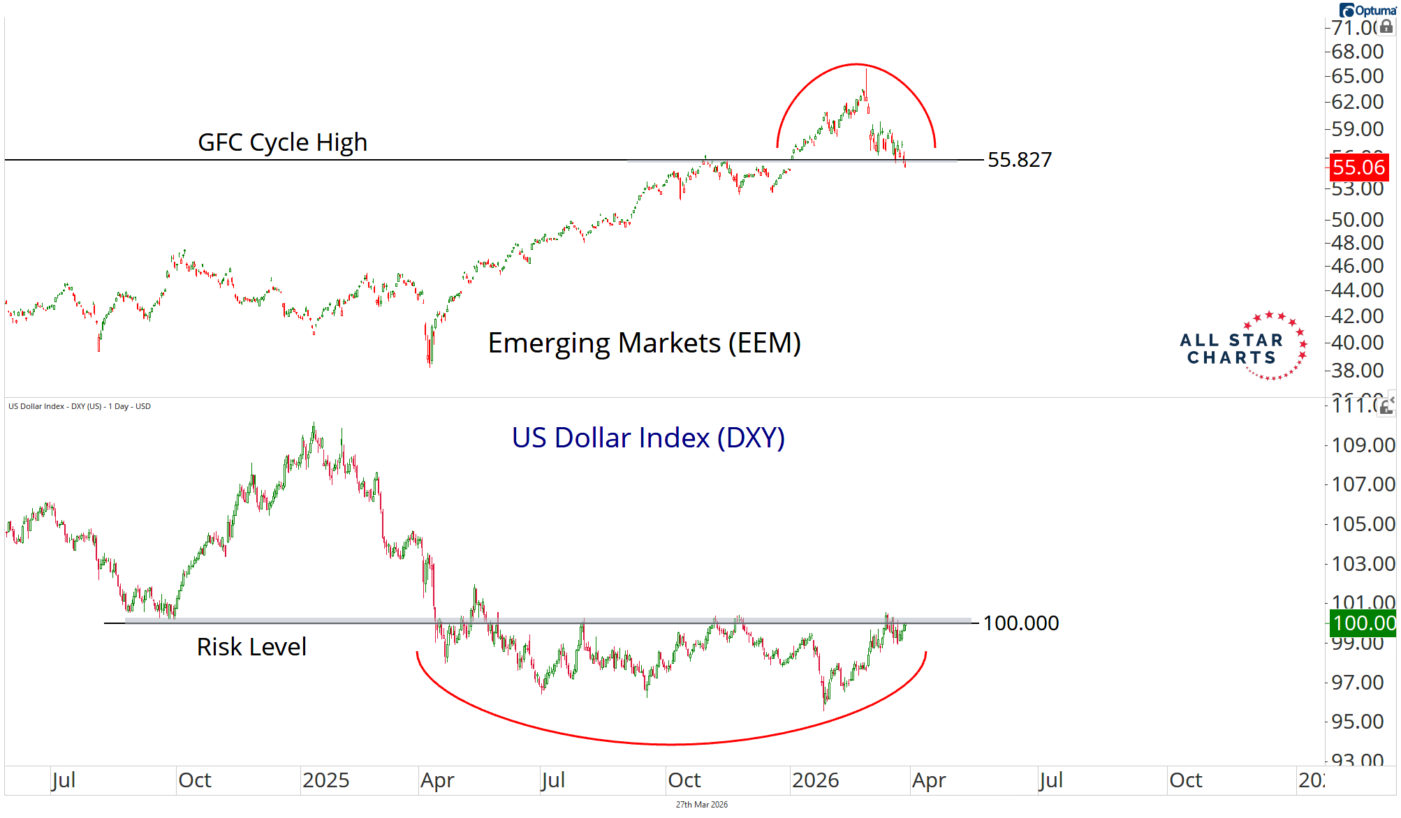 A Dollar breakout at the same time Emerging Markets fail. That combination can quickly turn an orderly pullback into something much sharper.