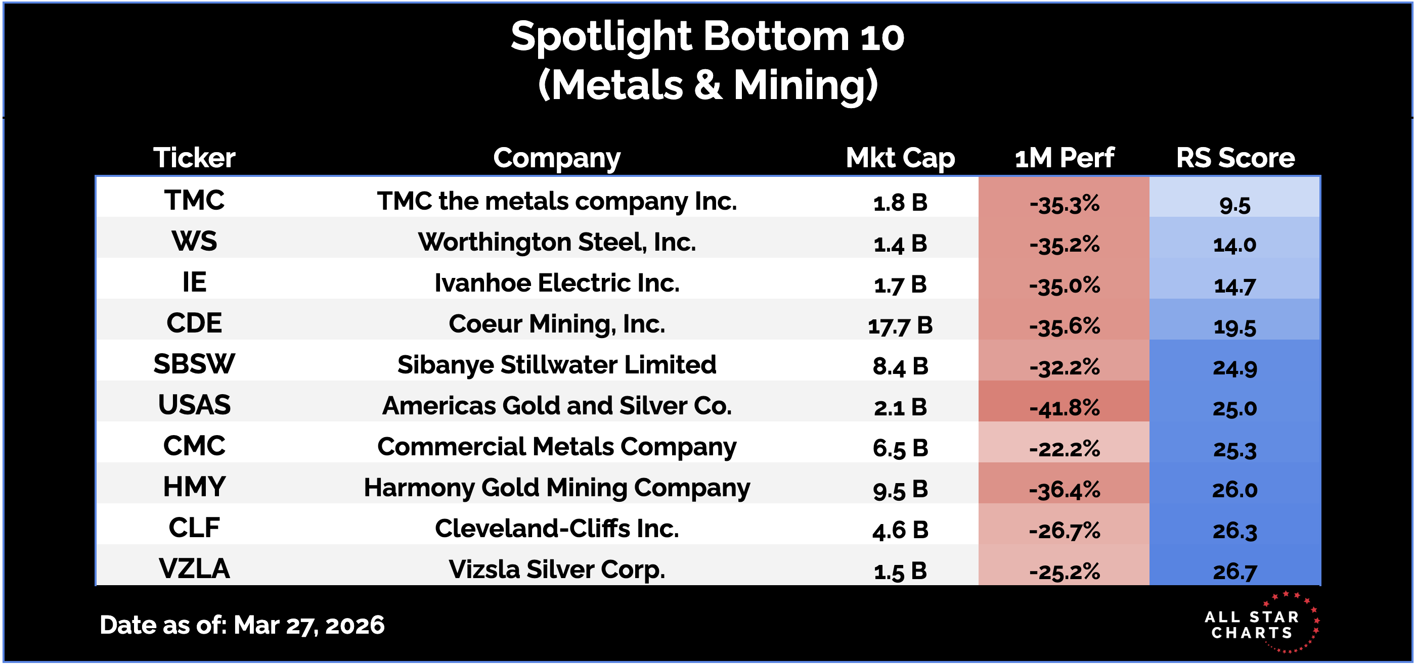 Here are the Bottom 10 names in the Metals & Mining subsector, ranked by the weakest relative performance.