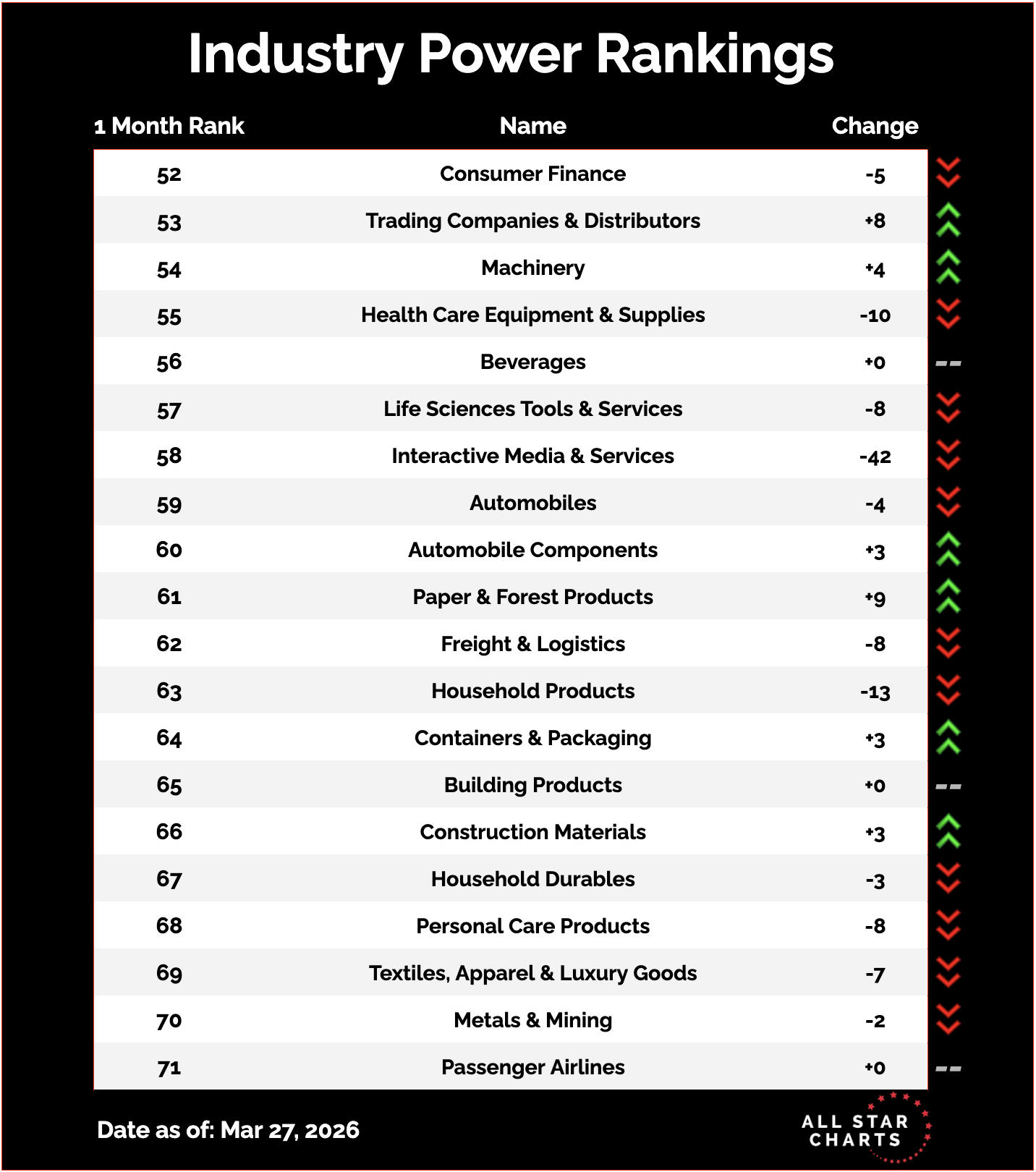 Here’s a peek at the bottom of our overall industry rankings, which shows Metals & Mining moving all the way down another 2 spots to sit 70th in our Industry Rankings.