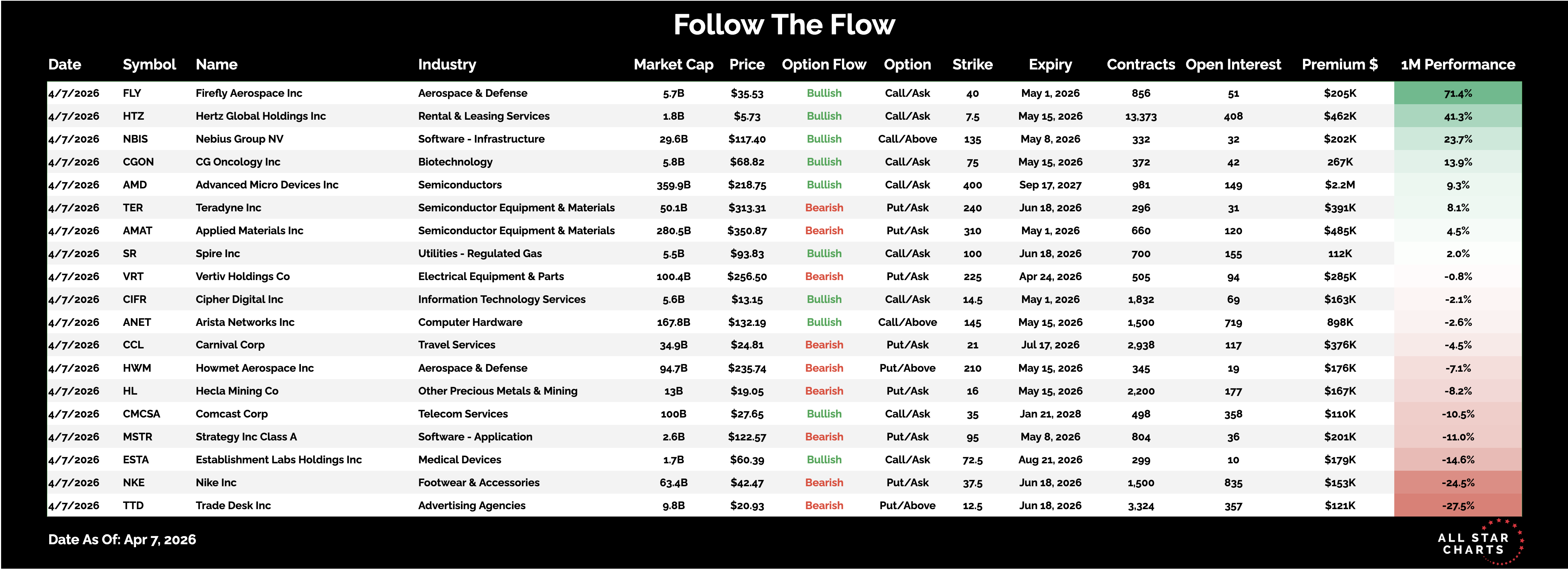 The Daily Flow Big Money Is Buying the Wreckage in HTZ, Betting Long on AMD, and Piling Into TTD Puts By Steve Strazza April 7, 2026 This note highlights a select group of stocks showing the most unusual — and highly directional — options activity.The goal is simple: follow the big money and trade in the direction of the underlying trend.Here is the list of Unusual Options activity from April 7: *Click to enlarge viewHertz Global Holdings $HTZ — The rental car space has been under pressure, but this kind of flow is hard to ignore.Traders swept 13,373 contracts of the 5/15 $7.5 calls — the largest contract count on the tape — a massive bet on a near-term reversal.Advanced Micro Devices $AMD — Semis remain volatile, but longer-dated bets suggest smart money is positioning for recovery.Bullish flow came in with 981 contracts of the 9/17/27 $400 calls, a patient, high-conviction bet on a move back to much higher levels.Trade Desk $TTD — One of the hardest-hit areas, and bears are still pressing.3,324 contracts of the 6/18 $12.5 puts traded — the second-largest print today — signaling continued downside pressure. All Star Charts Premium Service Menu Service (ASC Premium) Trade Ideas Conference Calls Research Reports 2 to 100 Club Boomtown Commodities Weekly Currency Report Follow The Flow Freshly Squeezed Hall of Famers International Hall of Famers Junior Hall of Famers Junior International Hall of Famers Minor Leaguers Supercycle Report The Bond Report The Short Report Top Down Trade Of The Week Top Stocks Of The Month Under The Hood Young Aristocrats Saturday Morning Chartoons Contact More from All Star Charts Premium Sam Gatlin The Most Hated Stocks Are Going Vertical Short sellers are being forced to unwind their positions, and it's sparking massive short squeezes. April 16, 2026 Sam Gatlin Junior Hall of Famers April 16, 2026 Steve Strazza The Daily Flow Uranium Is Glowing, Biotech Is Breathing, and the Big Bank Is Back April 15, 2026 More from All Star Charts Premium 2 to 100 Club Join Today The Strazza Letter Subscribe ASC Mastermind Join Today