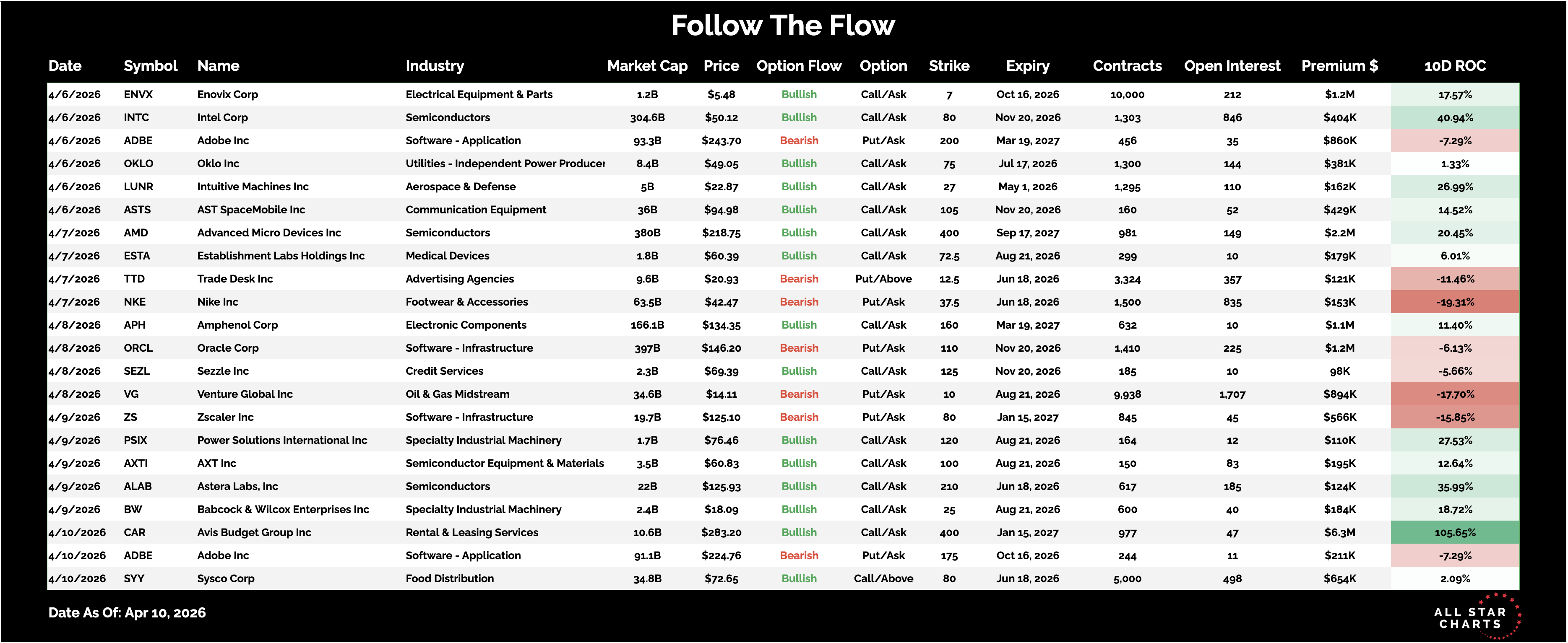 Members Only Follow the Flow The Satellite Trade Is On By Steve Strazza April 12, 2026 Every weekend I dig through the names that experienced the most interesting unusual options activity. We’re looking for trades that stood out, whether it was large in size or a very aggressive strike selection.This gives us a clean list to review and potentially add some names to our watchlists in preparation for the upcoming week.Here is the list of the most interesting Unusual Options activity from this past week: *Click to enlarge view You need to have a subscription to access this content in full. Log in or subscribe today to unlock new features and receive Member Benefits. Log in or Subscribe All Star Charts Premium Service Menu Service (ASC Premium) Trade Ideas Conference Calls Research Reports 2 to 100 Club Boomtown Commodities Weekly Currency Report Follow The Flow Freshly Squeezed Hall of Famers International Hall of Famers Junior Hall of Famers Junior International Hall of Famers Minor Leaguers Supercycle Report The Bond Report The Short Report Top Down Trade Of The Week Top Stocks Of The Month Under The Hood Young Aristocrats Saturday Morning Chartoons Contact More from All Star Charts Premium Sam Gatlin The Most Hated Stocks Are Going Vertical Short sellers are being forced to unwind their positions, and it's sparking massive short squeezes. April 16, 2026 Sam Gatlin Junior Hall of Famers April 16, 2026 Steve Strazza The Daily Flow Uranium Is Glowing, Biotech Is Breathing, and the Big Bank Is Back April 15, 2026 More from All Star Charts Premium ASC Mastermind Join Today The Strazza Letter Subscribe 2 to 100 Club Join Today