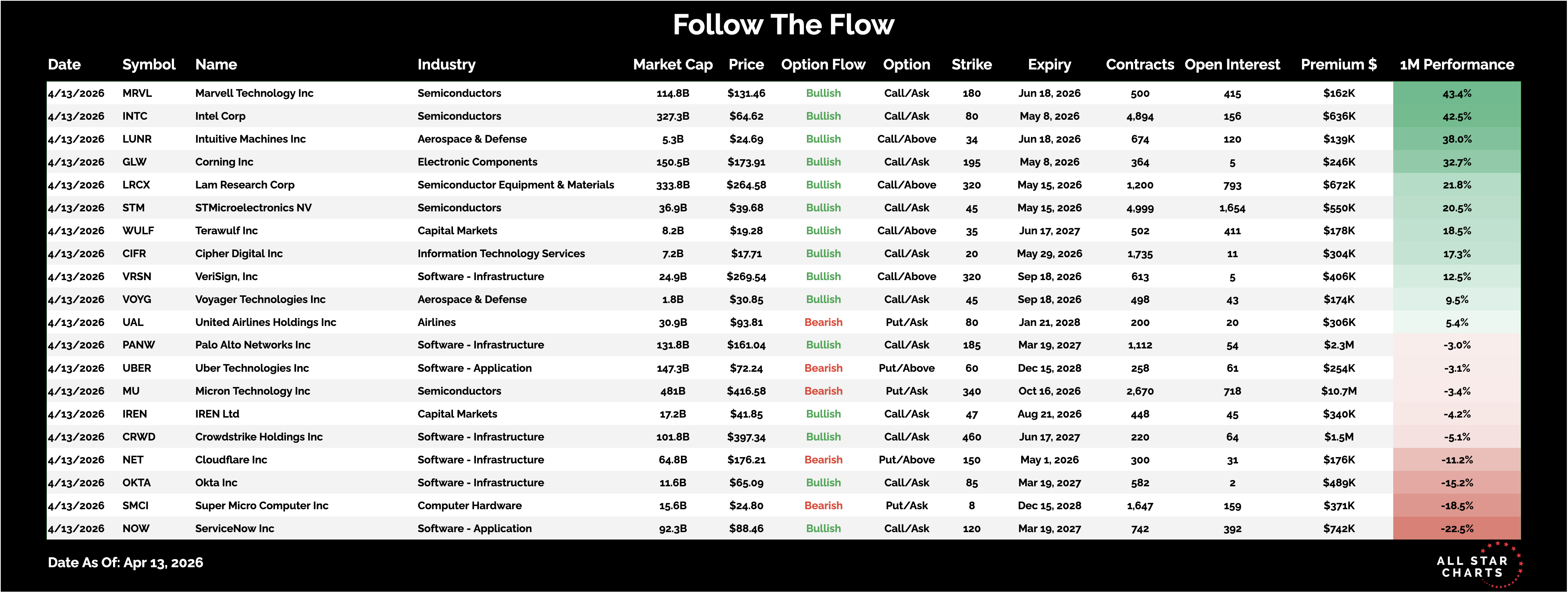 The Daily Flow Calls Are Flying in Defense, Infrastructure, and Crypto By Steve Strazza April 13, 2026 This note highlights a select group of stocks showing the most unusual — and highly directional — options activity.The goal is simple: follow the big money and trade in the direction of the underlying trend.Here is the list of Unusual Options activity from April 13: *Click to enlarge viewVoyager Technologies $VOYG — Aerospace and defense continues to lead, and that strength isn’t fading.Bullish flow showed up with 498 contracts of the 9/18 $45 calls, a directional bet on new 52-week highs into the fall.VeriSign $VRSN — The backbone of the internet rarely makes headlines, but institutional money continues to accumulate.Traders stepped in with 613 contracts of the 9/18 $320 calls, signaling conviction that this massive base breakout is here to stay.IREN Ltd $IREN — Bitcoin miners are back in focus as crypto sentiment improves and capital flows return.448 contracts of the 8/21 $47 calls traded, pointing to expectations of a meaningful upside move as this long consolidation resolves higher. All Star Charts Premium Service Menu Service (ASC Premium) Trade Ideas Conference Calls Research Reports 2 to 100 Club Boomtown Commodities Weekly Currency Report Follow The Flow Freshly Squeezed Hall of Famers International Hall of Famers Junior Hall of Famers Junior International Hall of Famers Minor Leaguers Supercycle Report The Bond Report The Short Report Top Down Trade Of The Week Top Stocks Of The Month Under The Hood Young Aristocrats Saturday Morning Chartoons Contact More from All Star Charts Premium Sam Gatlin The Most Hated Stocks Are Going Vertical Short sellers are being forced to unwind their positions, and it's sparking massive short squeezes. April 16, 2026 Sam Gatlin Junior Hall of Famers April 16, 2026 Steve Strazza The Daily Flow Uranium Is Glowing, Biotech Is Breathing, and the Big Bank Is Back April 15, 2026 More from All Star Charts Premium The Strazza Letter Subscribe ASC Mastermind Join Today 2 to 100 Club Join Today