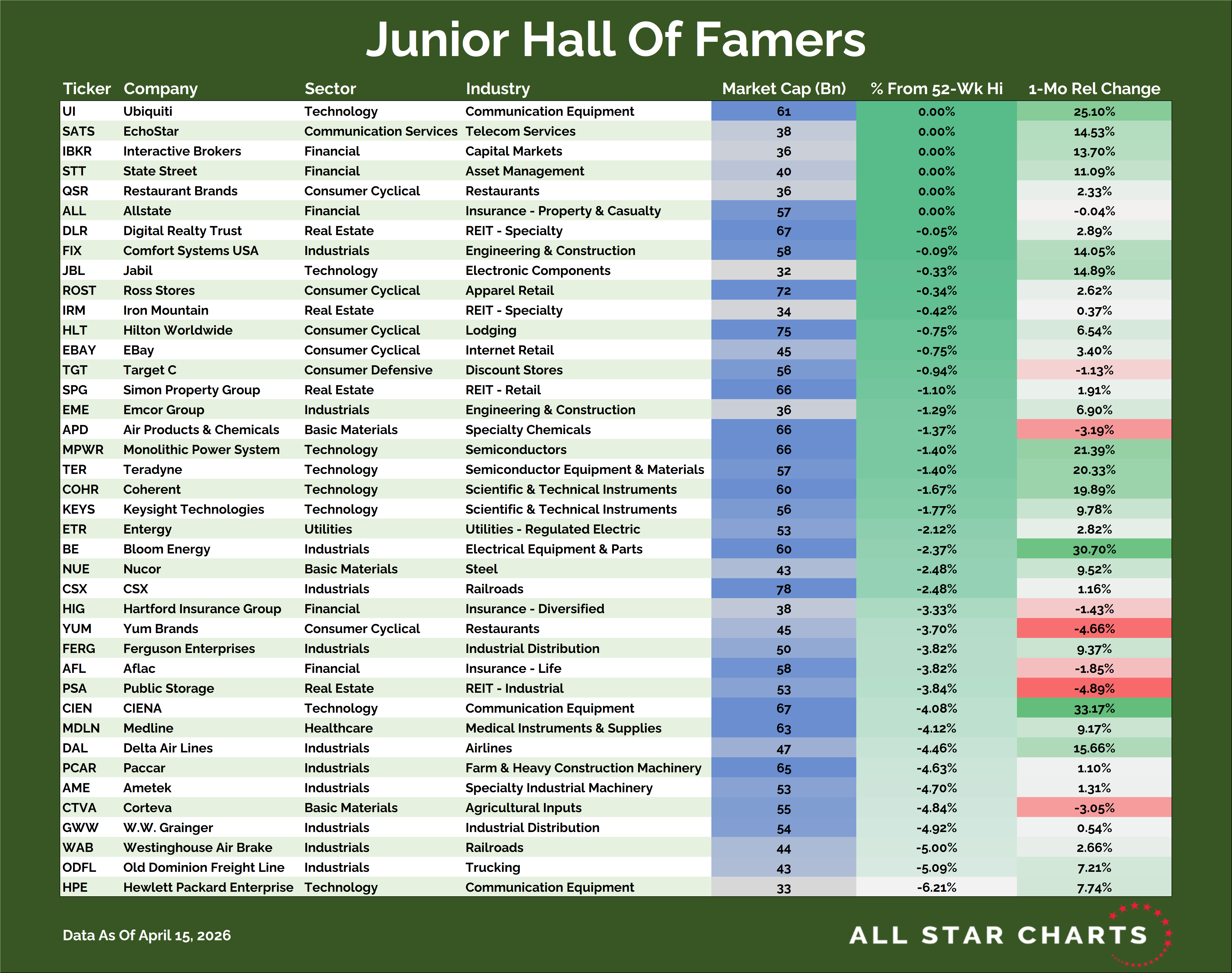 This scan is composed of the next 150 largest stocks by market cap, those that come after the top 150 and are thus covered by the Hall of Famers universe. Many of these names will someday graduate and join our original Hall Of Famers list. The idea here is to catch these big trends as early on as possible.